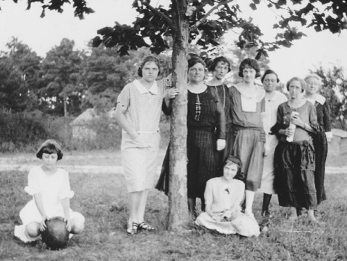 Left to right: Dorothy Seabrook Hart [Mittenzwei], Virginia Lomax Watson, Marina Duncan (Rena) Jones Watson, Lewis Pou Jones (Lewie), Flora Wingo Jones (second wife of Uncle James), Elizabeth Churchill (Bess) Jones, Margaret (Mag) Jones Hart, Tilla Lomax Jones. Seated center: Margaret Duncan Hart [Cannon].