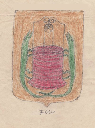 Rebecca Margaret Jones's mother was Ann Elizabeth Pou. On the left is drawing by Margaret Jones Hart; right is a coat of arms found on the internet.